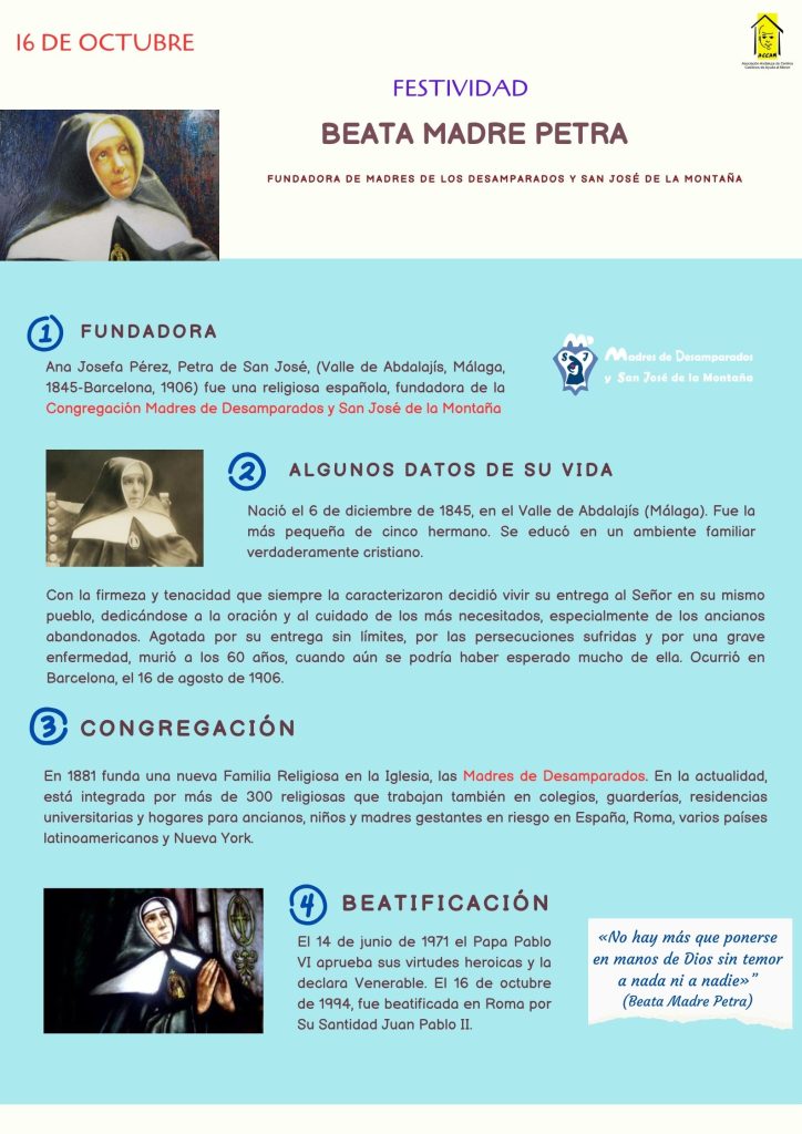 El 16 de octubre se celebra el día de la Beata Madre Petra, fundadora de la Congregación de Madres de Desamparados y San José de la Montaña.