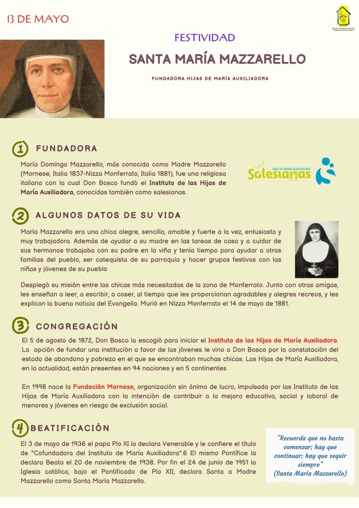 El 13 de de mayo se celebra el día de Santa María Mazzarello fundadora de las Hijas de Mª Auxiliadora Salesianas.