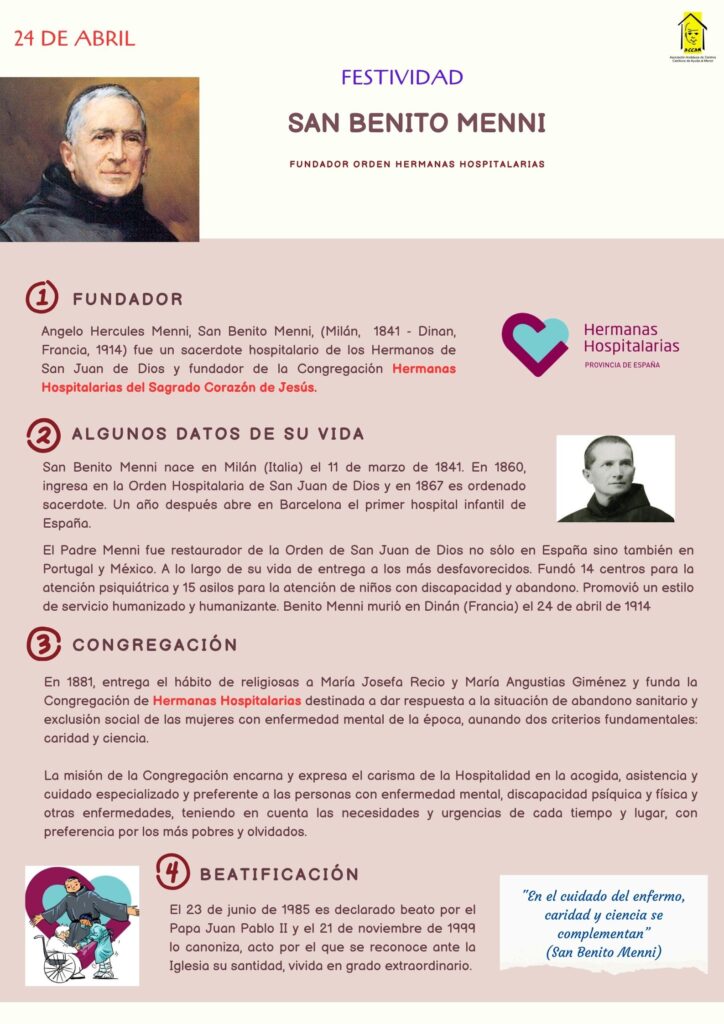 El 24 de abril se celebra la festividad de San Benito Menni, fundador de la Congregación Hermanas Hospitalarias del Sagrado Corazón de Jesús.