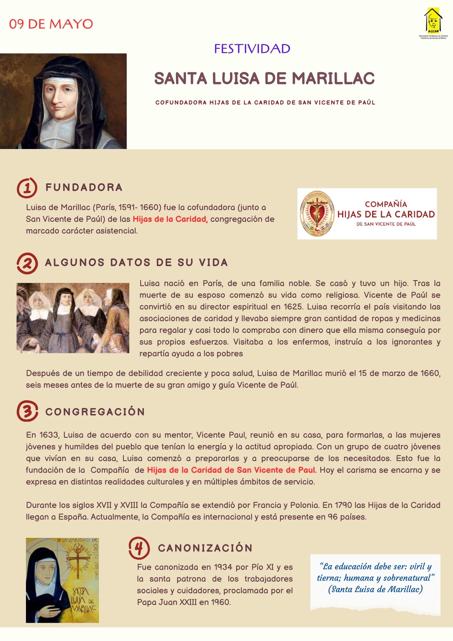 El 9 de mayo se celebra el día de Santa Luisa de Marillac, fundadora de la Compañía de las Hijas de la Caridad junto a San Vicente de Paúl.