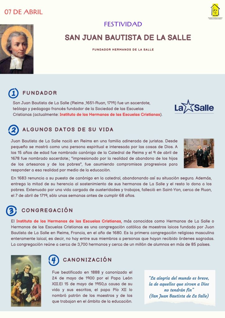 Hoy queremos felicitar a la comunidad educativa de La Salle que celebra uno de sus días grandes en torno a la figura de su fundador, San Juan Bautista de La Salle.